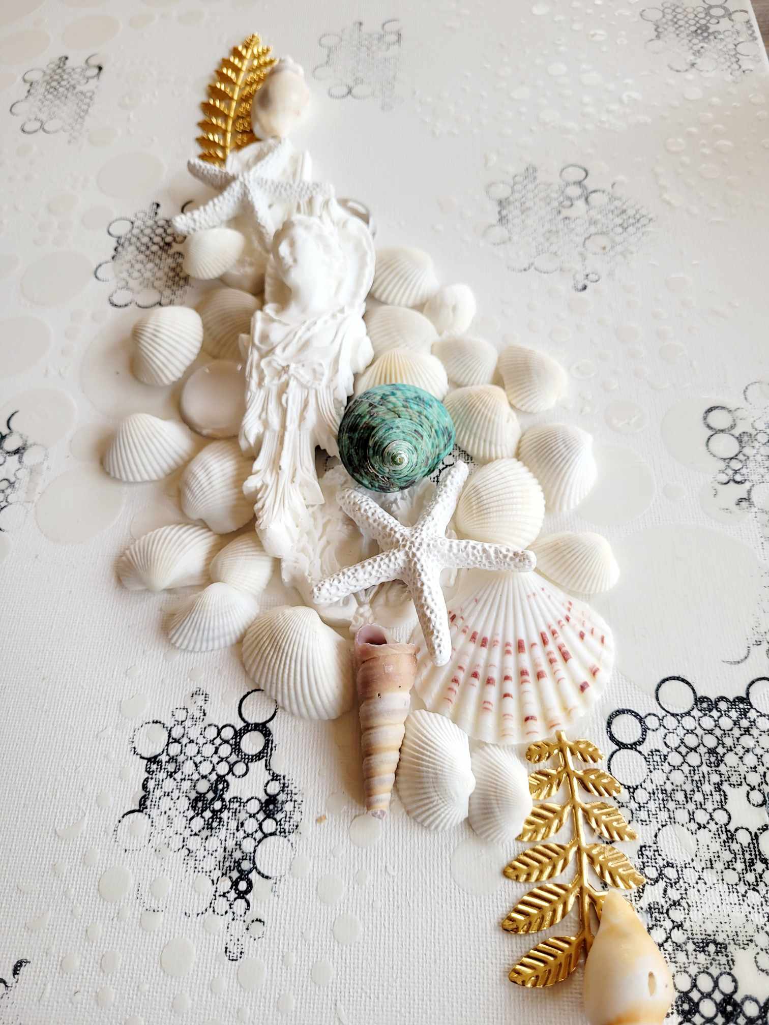 I used a resin frame I made with a Prima mould and some woodchip snowflakes. The metal flowers, metal snowflakes, leaves, stars and numbers are all from Prima. I added some plastic ornaments and some red beads from my stash. Everything was stuck in place with Prima 3D Matt Gel.